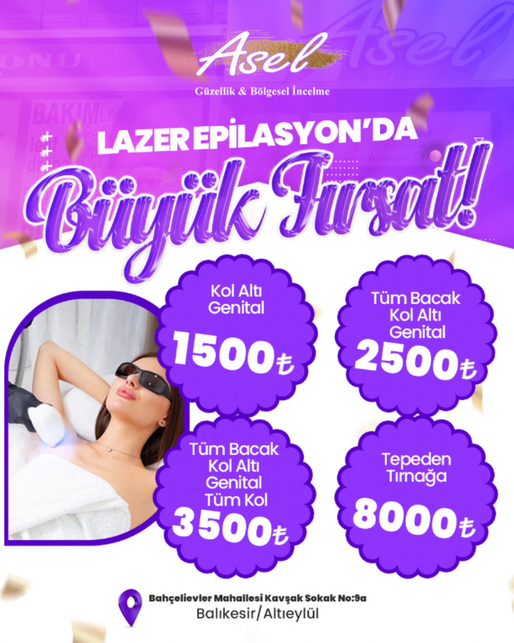 Asel Güzellik Merkezi, son teknoloji cihazlar ve uzman ekibiyle Balıkesir?de lazer epilasyon, cilt bakımı, bölgesel incelme ve kişisel bakım hizmetleri sunar. Güzelliğinize değer katmak için buradayız.
